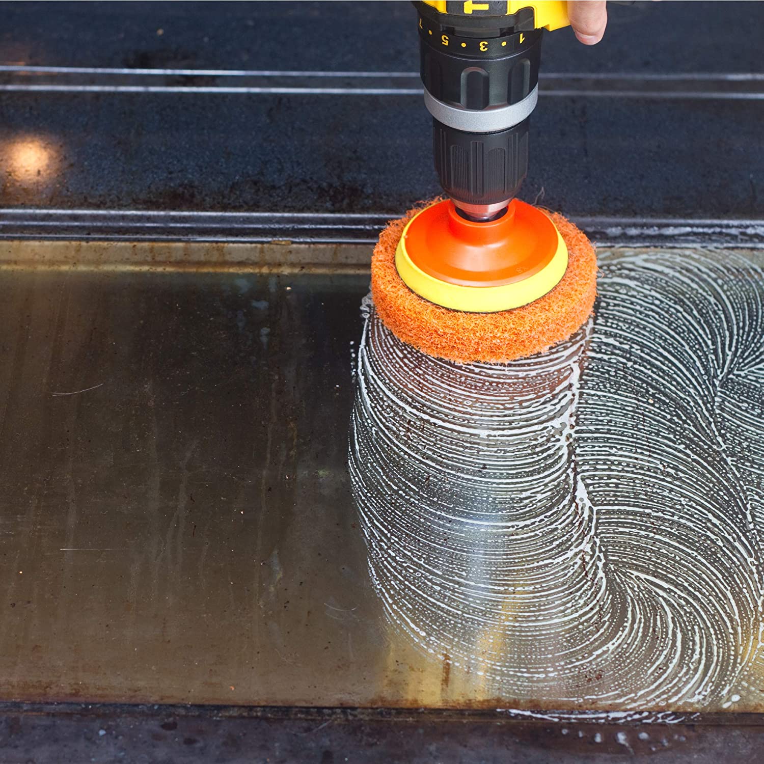 Our non-scratch scouring pads don't always have to be used with the backer pad. Use them by hand in a pinch. Alternately, you can attach any basic kitchen cleaning scouring pad or steel wool to the velcro pad and do your business. It works amazingly! Be responsible and test your surface as a power drill adds considerable more power to your scrubbing efforts.
